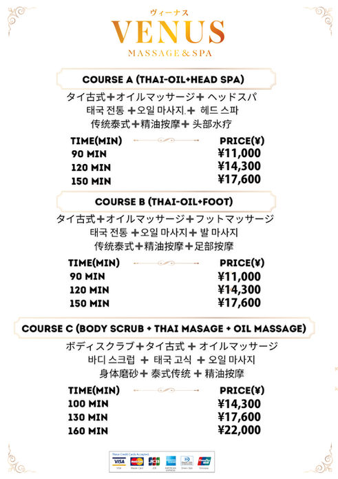 Venus offers Traditional Thai Massage, Oil Massage, Head & Fes Spa and Foot Massage Course. According to the customer's condition, we will relax not only the customer's body but also the mind with a careful massage with all the heart.